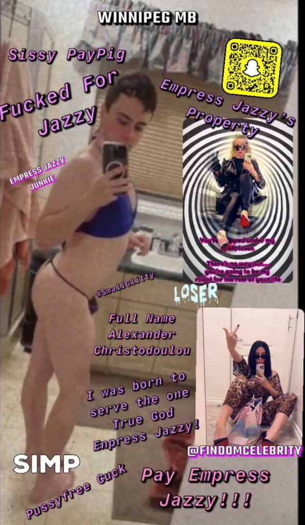 Sissy Alexis from Winnipeg wants to be pimped out to horny men by Empress Jazzy. He wants to be used by cock forever, and wants all his friends to catch him getting cream pied 😂 He’s the laughing stock of his college, and has a crush on a girl named Brooke, but she knows he’s an unfuckable joke after seeing his sissy pics 😂